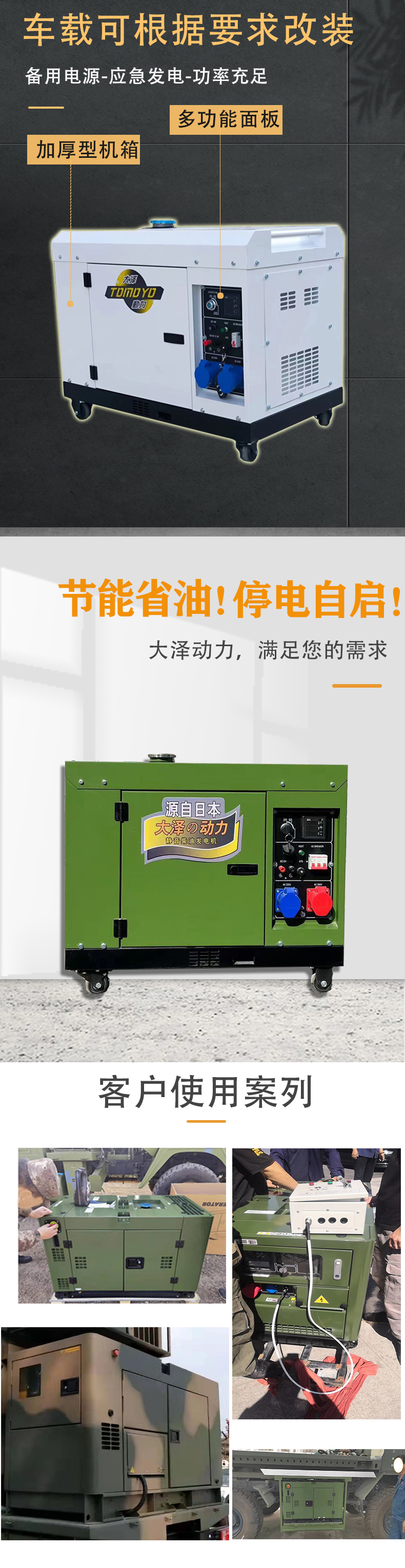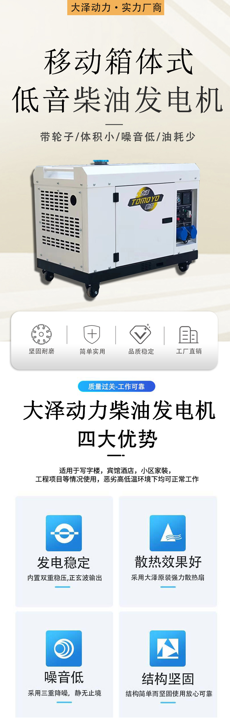 大泽静音柴油发电机具有技术经济指标先进、结构紧凑、启动迅速、易于操作、维修方便、能适应工作恶劣环境条件下作业等优点,广泛用于石油、矿山等企业