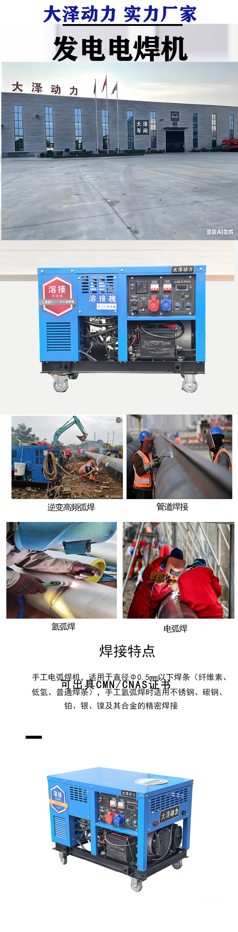 大泽发电电焊机优势:焊接时间长、发电机发电稳定、燃油低、移动方便,大泽动力与众不同的操作设计,简单易行,耗油量低,经济实用,经久耐用,可靠性高,省却繁琐的维修保养,配有保护装置,确保运作安全,采用静音防震设计。