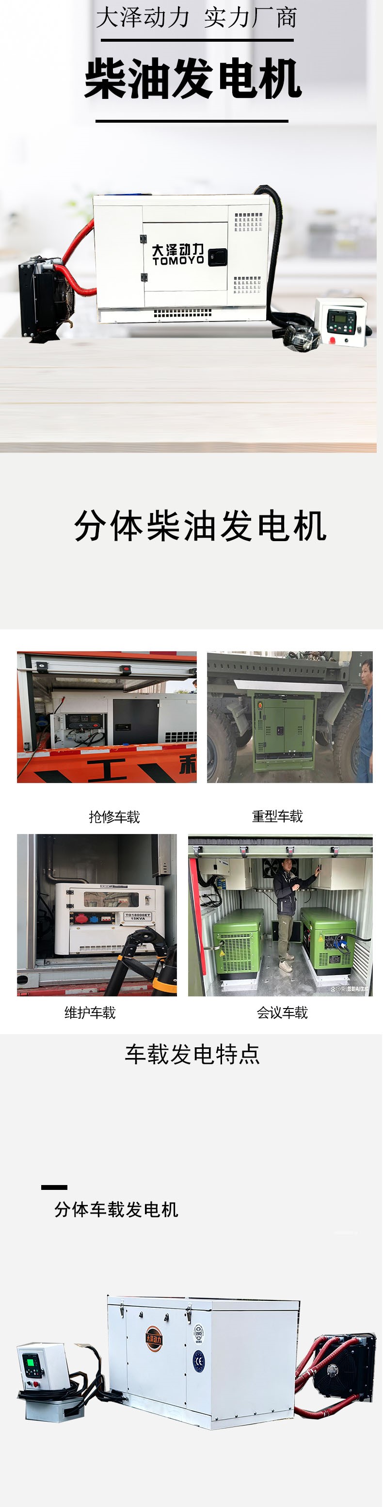 大泽动力分体式柴油发电机,一机一定制,可满足客户不同需求定制,真正的低噪音,适合不同车载电源使用。如有需要可咨询客服.