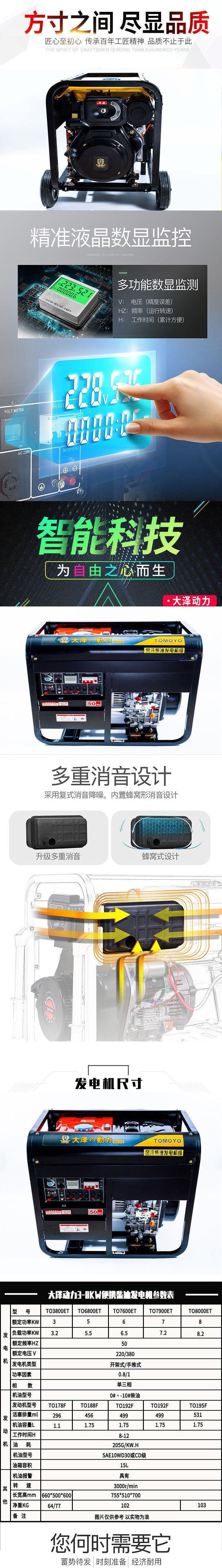 大泽动力柴油发电机组耗油量低极其省油:发动机采用大泽技术,优越的发动机带给您不一样的经济性能轻便:结构轻巧,便于搬运,让您摆脱老式柴油发电机组的笨重;而且操作简单:外观设计简单大,操作说明通谷易懂。噪音小,静音发电机组无论何时无论何处都能使用的低噪音发电机组。
