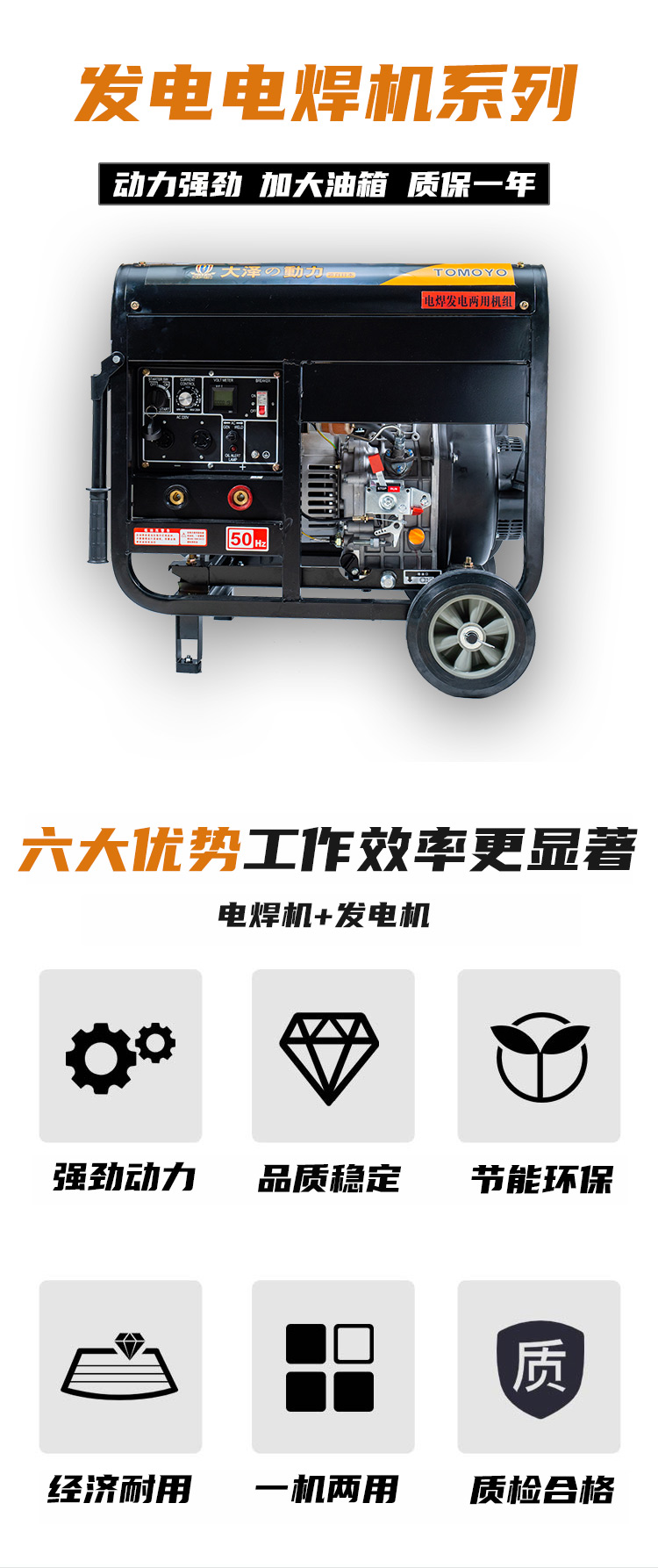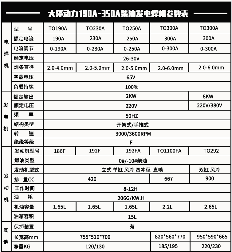 大泽发电电焊机优势:焊接时间长、发电机发电稳定、燃油低、移动方便,大泽动力与众不同的操作设计,简单易行,耗油量低,经济实用,经久耐用,可靠性高,省却繁琐的维修保养,配有保护装置,确保运作安全,采用静音防震设计。